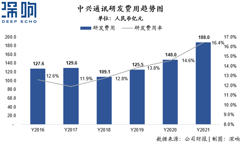 比如中兴,2021年,中兴通讯研发费用达到188亿元,相比2017年增长超过45%。在过去5年间,中兴通讯研发费用率也从2017年的11.9%,增加至2021年的16.4%。