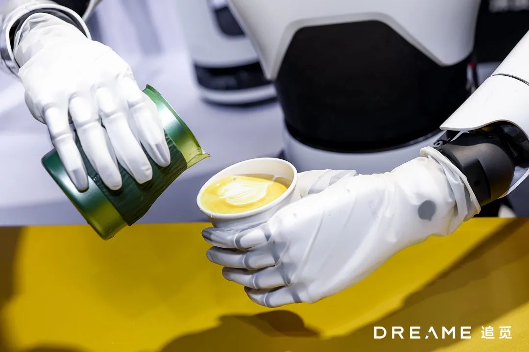 追觅科技人形机器人负责人喻超告诉「甲子光年」:“人形机器人自主实现咖啡‘拉花’的难点在于,它需要在开放空间里与人进行交互,这意味着它所处的空间位置和运动轨迹会有许多不确定性,同时需要识别不同材质及尺寸的工具。要解决这些问题,就要搭载更多的智能模型、传感器,并在机械结构设计上做创新调整。”
