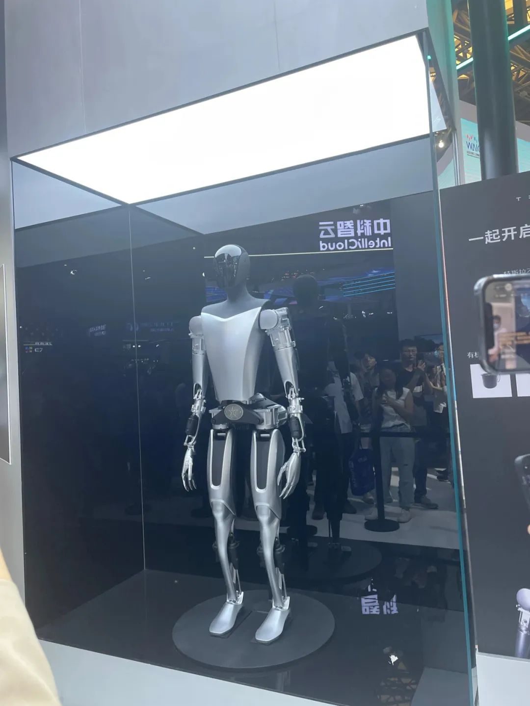 在特斯拉2022 AI Day活动上,特斯拉人形机器人“Optimus”首次亮相,并在现场完成了自主行走、转身、停止、挥手问候等动作。虽然在本届机器人大会中没有看到“Optimus”的身影,但在今年的世界人工智能大会上,我们在上海见到了一款在橱窗里的“Optimus”。