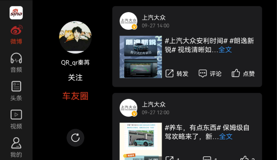此次微博车载APP与上汽大众的全面合作,将刷微博、听热搜、听新闻、看视频的全业态模式悉数开放。在不同的使用场景下,微博的社交属性实现全面释放,智能化座舱的娱乐体验和互动模式也得到进一步的实践和推广。