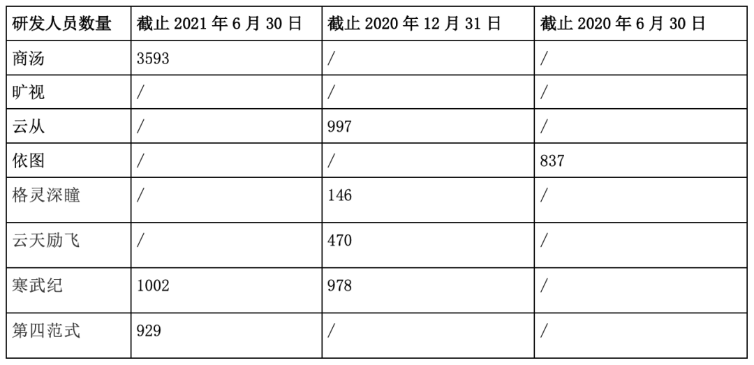 商汤三年半累计研发费用为69.9亿元。2018年、2019年、2020年及2021年上半年研发开支别为人民币8.5亿元、19.2亿元、24.5亿元及17.7亿元。