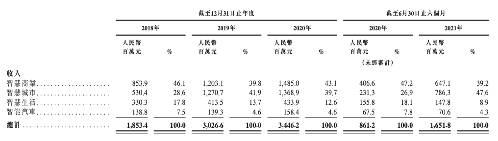 2020年智慧商业收入14.9亿元,占比43.1%;智慧城市收入13.7亿元,占比39.7%;智慧生活收入4.3亿元,占比12.6%;智慧汽车收入1.6亿元,占比4.6%。2021年上半年以上业务各收入6.5亿元、7.9亿元、1.5亿元、0.7亿元。