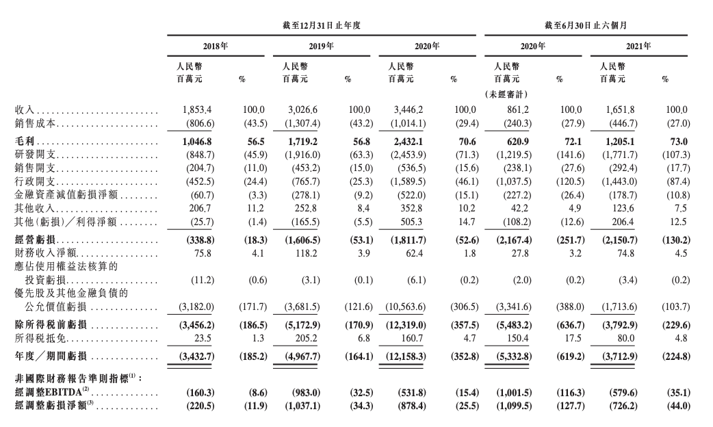 扣除优先股公允价值变动等非经常性损益之后,三年半累计扣非净亏损为28.6亿元。2018年、2019年、2020年及2021年上半年经调整的扣非净亏损分别为人民币2.2亿元、10.4亿元、8.8亿元及7.3亿元。