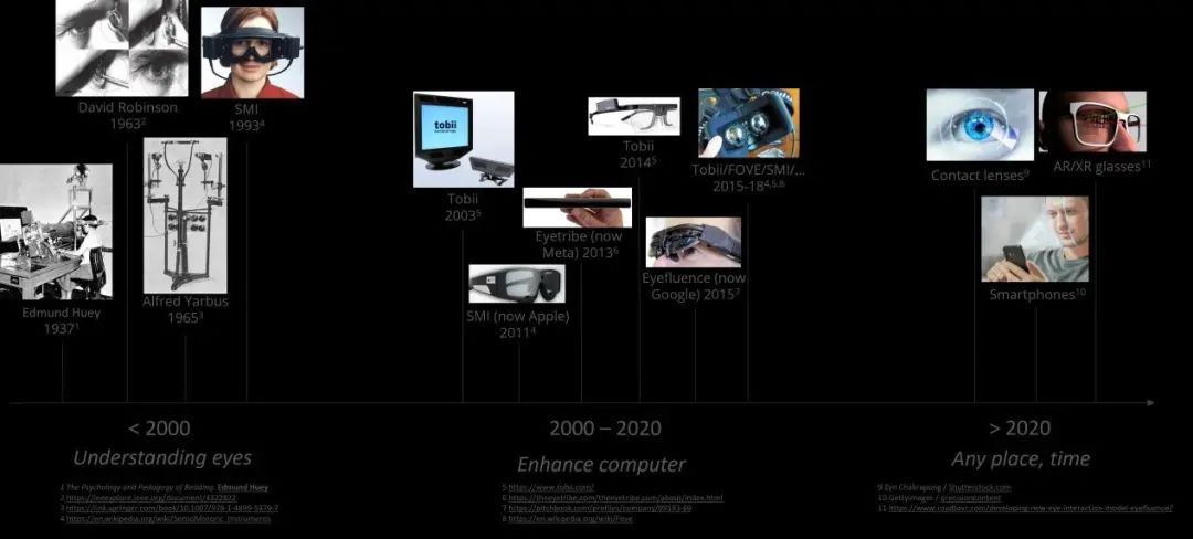 讲到眼动追踪,其实这项技术已经发展了多年,最早可以追溯到19世纪。在那时,人们就已经开始「人眼注视」相关研究。如果按照时间顺序来看,「眼动追踪」大致可以分为三个阶段,2000年以前的技术探索期,2000~2020年的技术应用期,2020年以后的技术迭代期。