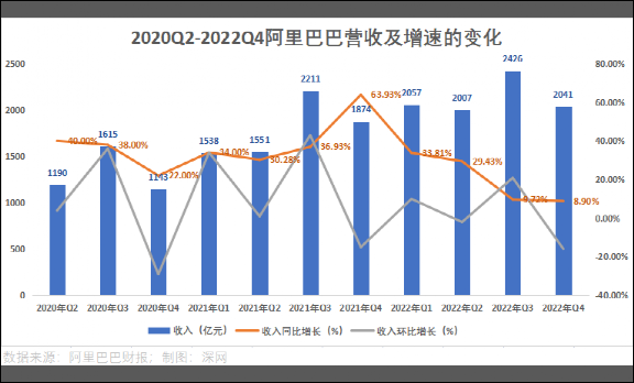阿里巴巴营收增速已连续4个季度下滑,最近五个季度增速分别为63.93%、33.81%、29.43%、9.72%以及最新的8.90%。