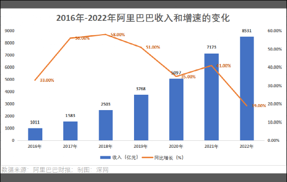 收入增速纷纷放缓,2022财年阿里巴巴营收8530.62亿元,同比增长19%,创历史最低值;经调整净利润1363.9亿元,同比下滑21%,为2017年后首次;经营利润为696.38亿元,同比下降22%,也为2017年后首次。