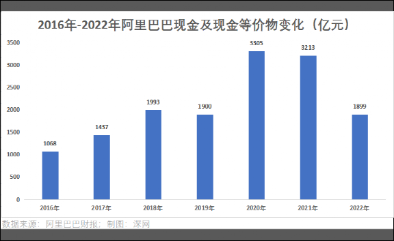 值得关注的是,阿里巴巴账面上现金及现金等价物大幅度降低,从去年同期的3213亿下跌至1899亿。
