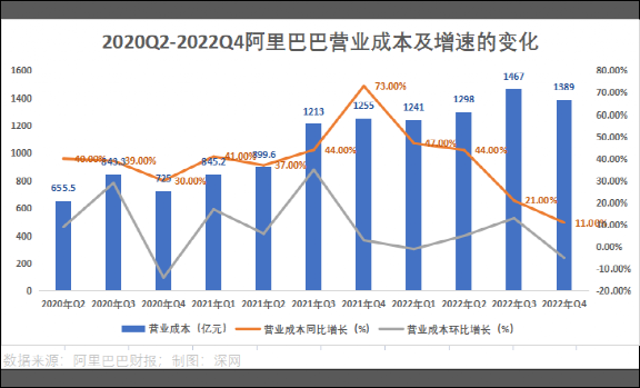 另一个得到控制的是营业成本,本季度财报阿里巴巴营业成本为1389亿元,同比增速仅有11%,环比甚至下降5%。