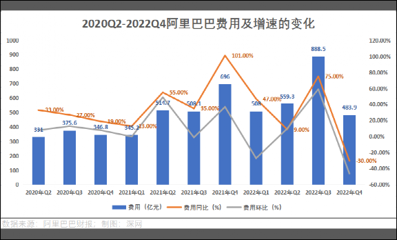 同时,阿里巴巴的费用也在本季度得到有效控制,从上季度的888.5亿元迅速下跌至483.9亿元。