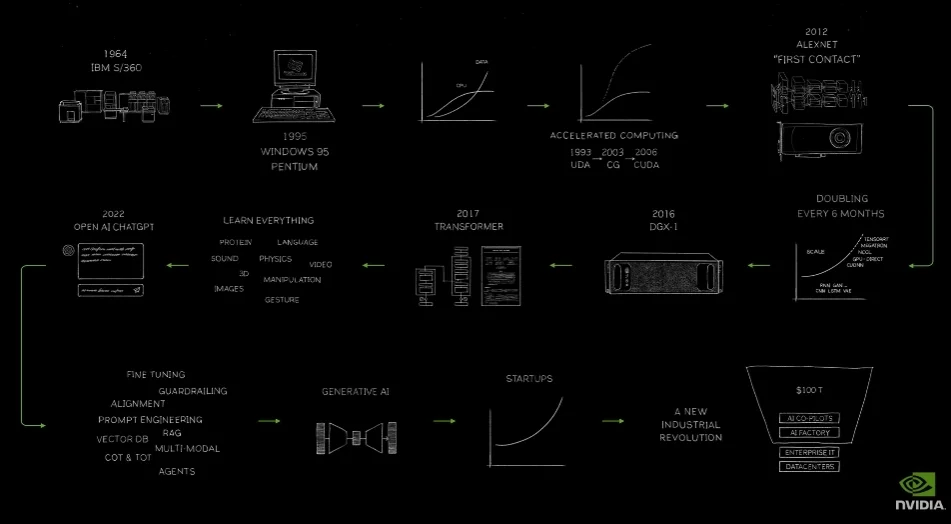 在前段时间的GTC 2024开幕演讲上,老黄也回顾了英伟达的发展史。