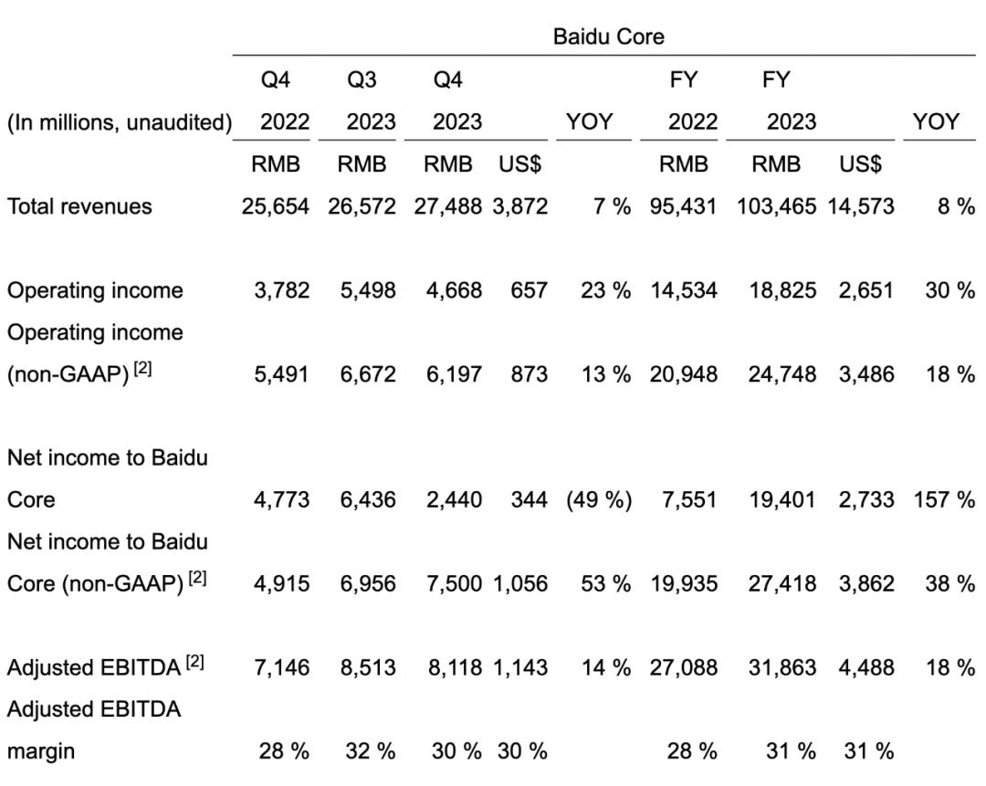 归属于百度的净利润为203亿元,每股美国存托股份的摊薄收益为55.08元。归属于百度核心的净利润为194亿元人民币,百度核心净利润率为19%。非GAAP归属于百度的净利润为287亿元人民币。非GAAP摊薄后每股美国存托股收益为80.85元。非公认会计原则归属于百度核心的净利润为274亿元,百度核心的非GAAP净利润率为26%。
